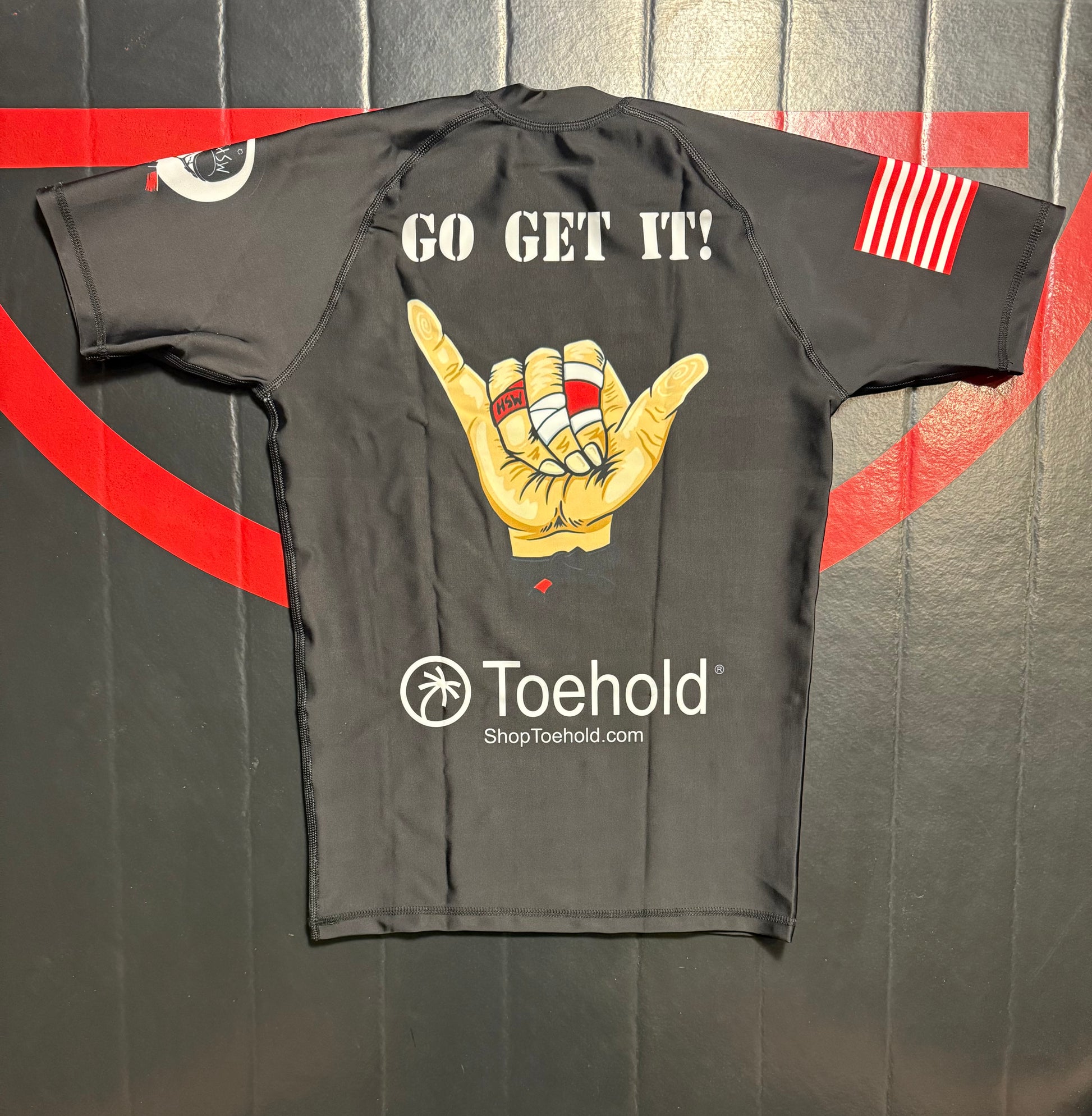 This is the collab that you've been waiting for! High Speed Warrior and Toehold® have teamed up to bring you a one-of-a-kind rash guard that will make heads turn wherever you go! On the front, you have the HSW and Toehold® logos. On the left sleeve, you have the HSW jiu-jitsu logo. On the right sleeve, you have the forward assault American flag. On the back, you have the "GO GET IT!" quote with the HSW shaka and Toehold® logo. Don't miss out on this! You will never see it again!